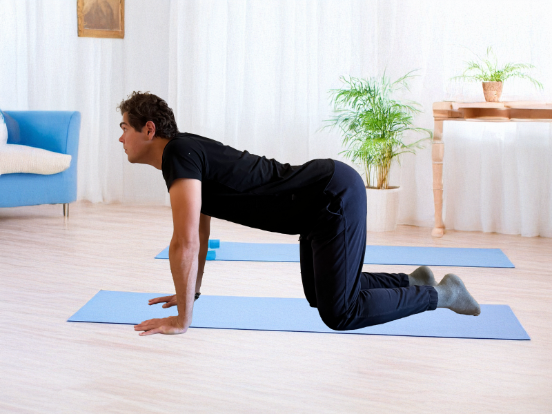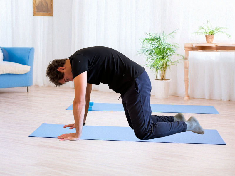 - Bij het inademen, laat je je buik naar de grond zakken en til je je hoofd en heupen op (Koe positie).