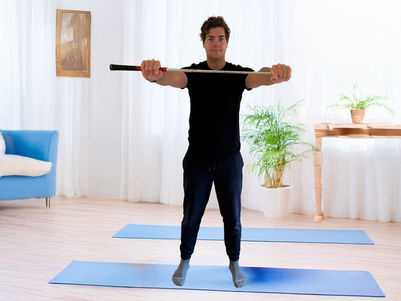 - Pak een golfclub of stok met beide handen vast, handen iets breder dan schouderbreedte.