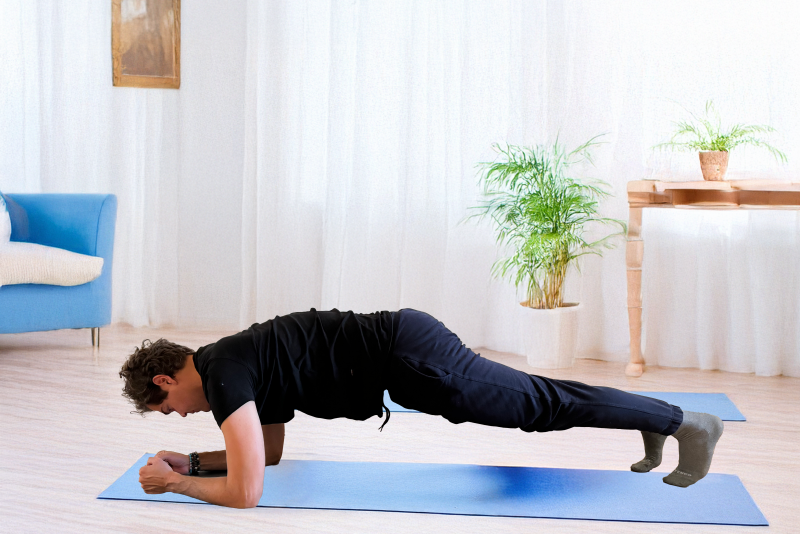 - Plaats je ellebogen direct onder je schouders en duw je lichaam omhoog