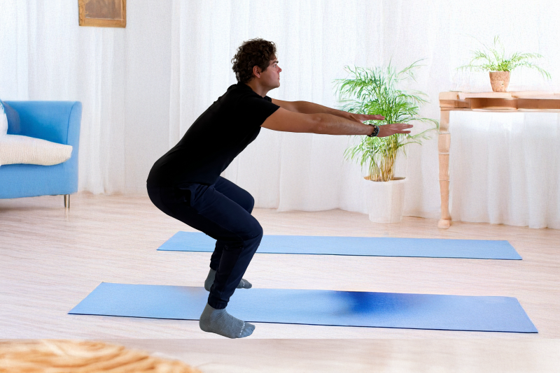 - zak door je knieën alsof je op een stoel gaat zitten,